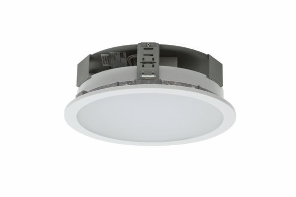 Downlight der EDLR-Produktfamilie. Lichtlenkung durch Abdeckung mikroprismatisch, Ausstrahlungscharakteristik symmetrisch, extrem breitstrahlend, Lichtaustritt direkt. Leuchtmittel LED-M eingebaut, Austausch durch Fachkraft möglich. Die Leuchte generiert einen Bemessungslichtstrom von 2480 lm in Lichtfarbe 830, Lichtstrom einstellbar: Nein. Die hohe LED-Lebensdauer ermöglicht einen langen Einsatz bei gleichbleibender Beleuchtungsgüte. Hohe Lichtqualität durch eine Farborttoleranz von < 3 SDCM. Gehäuse aus Aluminium, weiß, Schutzart IP20. Abdeckung aus PMMA strukturiert. Montage in gesägten Deckenöffnungen. Befestigungsklammern für Klemmdicken von 0 bis 25 mm. Mit elektronischem Betriebsgerät On/Off. Austausch durch Fachkraft möglich. Nennspannung 220 - 240 V AC/DC 50 - 60 Hz.