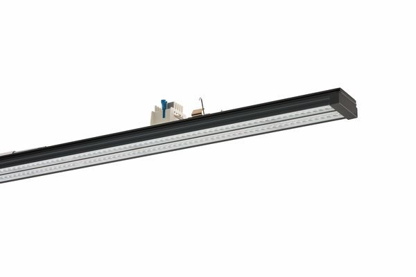 Geräteträger VLGFL der RIDI LINIA-Produktfamilie. Lichtlenkung durch Linse, Ausstrahlungscharakteristik symmetrisch, breitstrahlend, Lichtaustritt direkt. Leuchtmittel LED-M eingebaut, Austausch durch Fachkraft möglich. Die Leuchte generiert einen Bemessungslichtstrom von 14300 lm in Lichtfarbe 840. Die hohe LED-Lebensdauer ermöglicht einen langen Einsatz bei gleichbleibender Beleuchtungsgüte. Hohe Lichtqualität durch eine Farborttoleranz von < 3 SDCM. Lichtstrom in Stufen einstellbar von 7200 - 14300 lm. Gehäuse aus Aluminium, schwarz, ähnlich RAL 9005, Schutzart IP54. Einfaches Einclipsen zur elektrischen Kontaktierung und mechanischen Befestigung im systemgebundenem LINIA Tragschienensystem. Mit elektronischem Betriebsgerät xFlex. Austausch durch Fachkraft möglich. Nennspannung 220 - 240 V AC/DC 50 - 60 Hz.