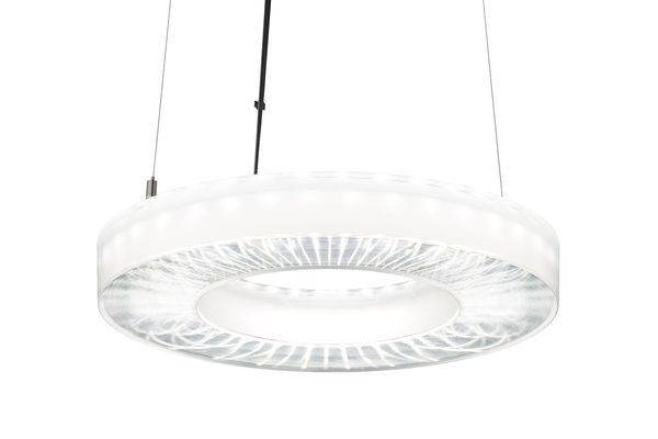 Pendelleuchte der IRIS-Produktfamilie. Lichtlenkung durch Abdeckung radialprismatisch, Ausstrahlungscharakteristik symmetrisch, breitstrahlend, Lichtaustritt direkt/indirekt. Leuchtmittel LED-M eingebaut, Austausch durch Fachkraft möglich. Die Leuchte generiert einen Bemessungslichtstrom von 4680 lm in Lichtfarbe 830, Lichtstrom einstellbar: Nein. Die hohe LED-Lebensdauer ermöglicht einen langen Einsatz bei gleichbleibender Beleuchtungsgüte. Hohe Lichtqualität durch eine Farborttoleranz von . Gehäuse aus Kunststoff, transparent, Schutzart IP20. Mit elektronischem Betriebsgerät On/Off. Austausch durch Fachkraft möglich. Nennspannung 220 - 240 V AC/DC 50 - 60 Hz.