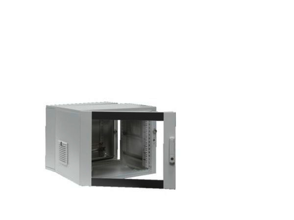 Wandverteiler (3-teilig) mit zwei senkrechten Montageschienen und eine C-Profilschiene waagerecht zur Kabelabfangung montiert, 1 Kabelflanschplatte oben geschlossen, 1 Kabelflanschplatte unten mit Bürsteneinsätze, Erdungsschiene mit sternpunktförmiger Erdung, 4 Wandbefestigungshalter 10 mm, 1 Schwenktteil, 2 x 19''-Profilschienen, stufenlos tiefenverstellbar. Seitlich links und rechts je ein Austrittsfilter, eine Design-Frontür mit 3 mm Sicherheitsglasscheibe und ein Mini-Komfortgriff für Verschluss-Einsätze.