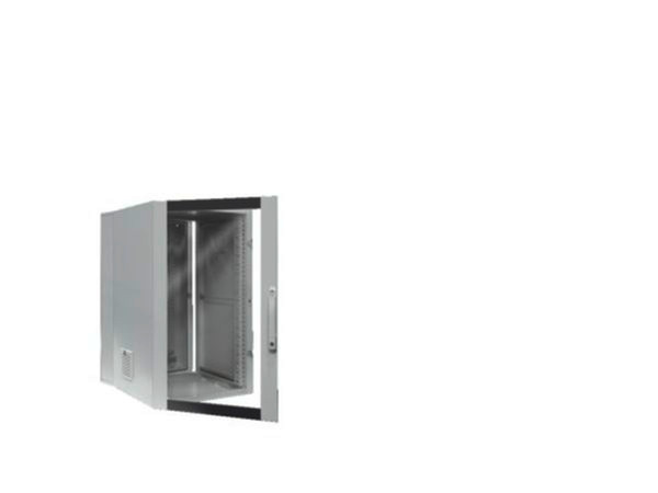 Wandverteiler (3-teilig) mit zwei senkrechten Montageschienen und eine C-Profilschiene waagerecht zur Kabelabfangung montiert, 1 Kabelflanschplatte oben geschlossen, 1 Kabelflanschplatte unten mit Bürsteneinsätze, Erdungsschiene mit sternpunktförmiger Erdung, 4 Wandbefestigungshalter 10 mm, 1 Schwenktteil, 2 x 19''-Profilschienen, stufenlos tiefenverstellbar. Seitlich links und rechts je ein Austrittsfilter, eine Design-Frontür mit 3 mm Sicherheitsglasscheibe und ein Mini-Komfortgriff für Verschluss-Einsätze.