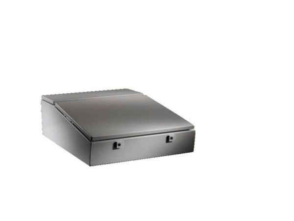 oben geschlossen, Material: Stahlblech, Gehäuse: 1,5 mm, Deckel: 2,0 mm, Design-Griffleiste: Aluminium, natur eloxiert, Schutzecken und Schloßabdeckung, RAL 7015: Kunststoff selbstverlöschend, Oberfläche: Gehäuse und Deckel: tauchgrundiert, außen pulverbeschichtet in RAL 7035 Struktur, Lieferumfang: Gehäuse mit Deckel, hinten scharniert, 2 Aufsteller mit automatischer Ver- und Entriegelung, Flanschplatten-Öffnung zur Kabeldurchführung im Gehäuseboden.