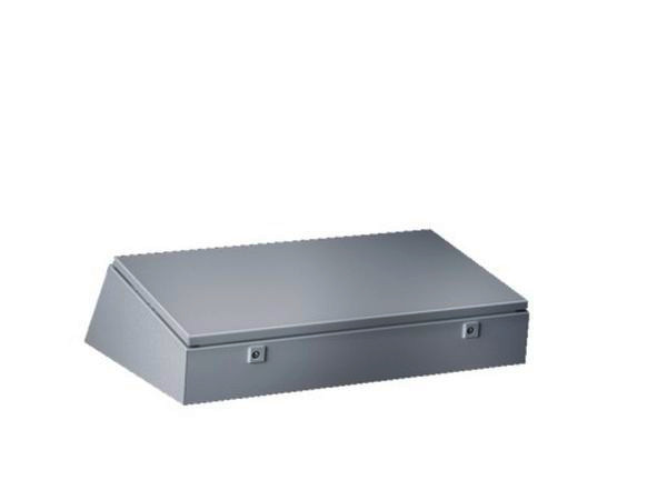 vorbereitet für Oberteil, Stahlblech, Gehäuse: 1,5 mm, Deckel: 2,0 mm, Design-Griffleiste: Aluminium, natur eloxiert, Schutzecken und Schloßabdeckung, RAL 7015: Kunststoff selbstverlöschend, Oberfläche: Gehäuse und Deckel: tauchgrundiert, außen pulverbeschichtet in RAL 7035 Struktur, Lieferumfang, Gehäuse mit Deckel, hinten scharniert, 2 Aufsteller mit automatischer Ver- und Entriegelung, Flanschplatten-Öffnung zur Kabeldurchführung im Gehäuseboden