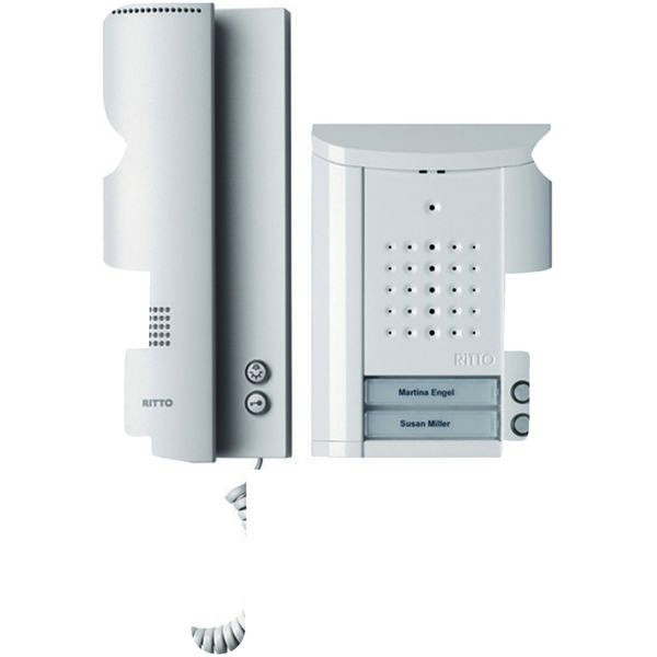 Komplett-Paket mit Preisvorteil. Inhalt -Kompakte Türstation Entravox in silber eloxiert oder weiß lackiert. 2 beleuchtete Klingeltasten und Namensschilder. 2 TwinBus Wohntelefone 17630xx weiß. Entravox Netzgerät. Farbe weiß/weiß.