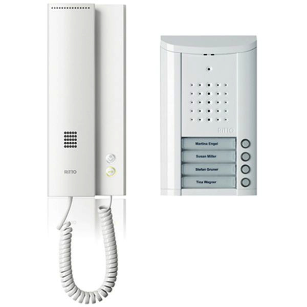 Komplett-Paket mit Preisvorteil. Inhalt -Kompakte Türstation Entravox in silber eloxiert oder weiß lackiert. 4 beleuchtete Klingeltasten und Namensschilder. 4 TwinBus Wohntelefone 17630xx weiß. Entravox Netzgerät. Farbe weiß/weiß.