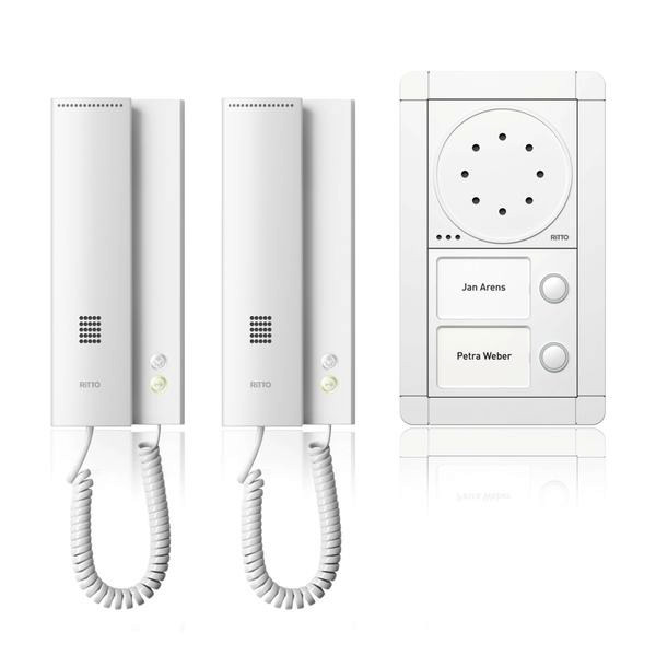 Audio-Türsprechanlage im Komplettpaket, Portier Modul-Türstation in silber oder weiß, Rahmen AP 2-fach, Türsprechmodul.1-2 beleuchtete Klingeltasten und Namensschilder, 1-2 Wohntelefone 1763070, weiß, Netzgerät 17573.