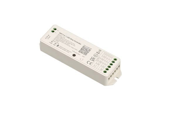 5 in 1 Wifi LED / RGB / RGBW / CCT Empfänger mit "Alexa" Steuerung, Eingangsspannung: 12-24V DC / Ausgangsstrom: 6A pro Kanal, max. 15A, Ausgangsspannung: 12-24V DC / Leistungsaufnahme: max. 120W bei 12V, max. 240W bei 24V / Betriebstemperatur: -20 ~ 60°C / Reichweite bis 30m