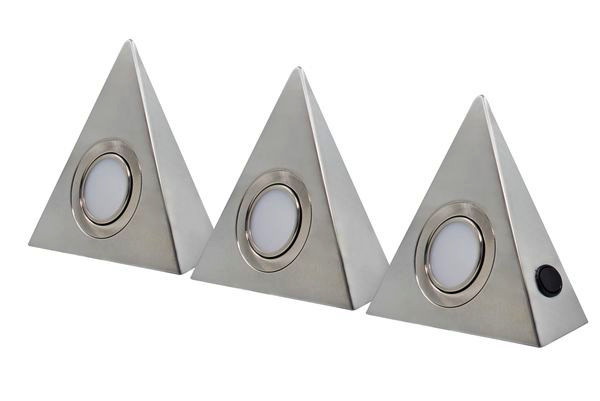 Leistung: 3x 3W / Spannung: 12V DC / Lichtfarbe 3.000K / Lichtstrom: 3x 190lm, Abstrahlwinkel: 90° / LEDs: 3x 12x 2835 SMD / Schutzart: IP20, Farbe: matt-chrom / Edelstahl-Dreieckgehäuse / inkl. 1,8m Zuleitung + Mini-Stecker, inkl. 15W, 12V DC LED-Konverter mit Mini-Verteiler + 1,8m Euro-Netzzuleitung