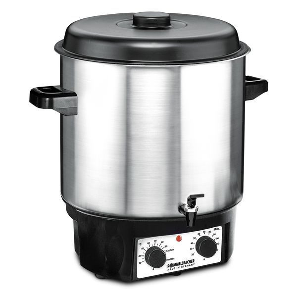 Glühwein- und Einkochvollautomat;Einkochautomatik für selbständige Steuerung des Einkochvorgangs;120 Minuten Zeitschaltuhr, Dauerbetriebsstufe;mit Ablaufhahn;hochwertiger, pflegeleichter und robuster Topf aus gebürstetem Edelstahl;Inhalt: 27 Liter bzw. für 14 Gläser à 1 Liter;stufenlose Temperaturregelung;Entsafter-Schaltung;integrierter Präzisionsthermostat für konstante Temperatur;wärmeisolierte Griffe, abnehmbarer Deckel;geschlossener Topfboden für leichte Reinigung;Kontrolllampe, Überhitzungsschutz, Kabelaufwicklung;Inklusive: Einlegerost