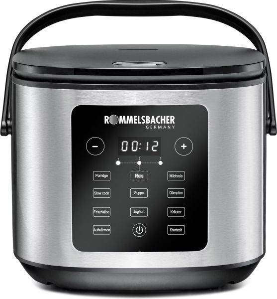 robuster, herausnehmbarer 5 l Innentopf mit Griffen (3,5 l Nutzvolumen) für bis zu 16 Portionen Reis, keramische Antihaftbeschichtung (PFAS-frei), abnehmbarer Innendeckel aus poliertem Edelstahl, innovative 3-D-Heiztechnologie, extrem präzise elektronische Temperaturregelung, LED-Display und Touch Control Sensoren für intuitive Bedienung, 12 Programme:- 3 Automatik-Reisprogramme (für gängige Reissorten und Getreide, wie z.B. Dinkel, Quinoa) und - 9 Programme mit variablen Laufzeiten, Reisprogramme mit Warmhaltefunktion 60 Min., Startzeitvorwahl bis 24 Std., 3-fach Überhitzungsschutz, praktischer Transportgriff, inklusive: Edelstahl Dämpfeinsatz, Servier- und Suppenlöffel, Messbecher, abnehmbares Netzkabel