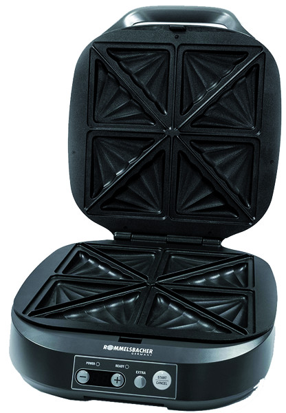 große Backmulden für 4 American XL Sandwiches (ca. 12,5 x 12,5 cm), massive Alu-Druckguss Platten, Antihaftbeschichtung, Cool Touch Gehäuse und wärmeisolierter Handgriff, LED-Display, Soft-Touch Tasten, 15 Min. Zeitschaltuhr für individuelle Backzeiten, Taste zum Nachbräunen, automatische Abschaltung, Kontrolllampen, Kabelaufwicklung, platzsparende senkrechte Aufbewahrung, H/B/T: 130/365/315 mm