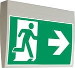 Schlanke, elegante, konvexe, zum Betrachter geneigte Kunststoffleuchte, die sich nach unten stufenlos symmetrisch verjüngt. Geeignet zur ein- oder zweiseitigen Beschriftung. Die Piktogramme werden Lösemittelfrei eingesteckt.Durch den Verrastmechanismus zwischen Ober- und Unterteil wirkt die Leuchte harmonisch und rundum geschlossen. Der Netzanschluß erfolgt im Deckenanbaukörper, beim Schließen der Leuchte erfolgt die Versorgung der Leuchte über Steckkontakte. Dies erleichtert ungemein die Montage und ermöglicht trotz der geringen größe der Leuchte einen bequemen Anschluß.