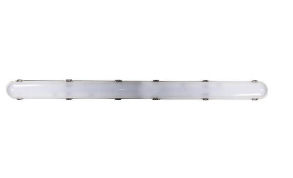 LED-Wannenleuchte, Serie VASCA. Gehäuse aus Polycarbonat. Prismatischer Diffusor aus UV-resistentem PC. Die Befestigung des Diffusors erfolgt mit Edelstahlclipsen. Die LED Platine ist einzeln austauschbar. Zudem verfügt die Leuchte über eine Durchgangsverdrahtung. Die Leistung (36 - 55W / 4400 - 7700lm) und Farbtemperatur (3000 - 4000 - 5000K) ist individuell per Dip-Schalter einstellbar.