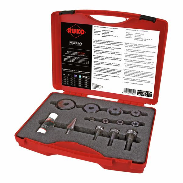 Mit wenigen Handgriffen dünnwandige Materialien schnell, mühelos, sauber und gratfrei lochen. Das Kugellager macht die Handhabung noch leichter und schneller. Der Kraftaufwand wird um ca. 67 % verringert. Besonders gut geeignet für den Einsatz mit Schraubenschlüsseln, Handhydraulikstanzen oder Fußhydraulikstanzen. 13-teiliger Schraublochstanzen-Satz 8 Schraublochstanzen Ø 15,2 (PG 9) - 18,6 (PG 11) - 20,4 (M 20 / PG 13,5) - 22,5 (PG 16) - 28,3 (PG 21) - 37,0 (PG 29) - 47,0 (PG 36) + 54,0 mm (PG 42) + 1 Blechschälbohrer HSS Gr. 2 + 1 Schneidpaste 30 g + 1 Zugschraube MF 10 x 1,0 x 45 + 1 Zugschraube MF 12 x 1,5 x 55 + 1 Zugschraube MF 16 x 1,5 x 60
