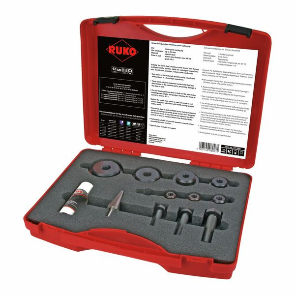 Mit wenigen Handgriffen dünnwandige Materialien schnell, mühelos, sauber und gratfrei lochen. Besonders gut geeignet für den Einsatz mit Schraubenschlüsseln, Handhydraulikstanzen oder Fußhydraulikstanzen. 12-teiliger Schraublochstanzen-Satz 7 Schraublochstanzen Ø 16,5 (M 16) - 20,4 (M 20 / PG 13,5) - 25,4 (M 25) - 32,5 (M 32) - 40,5 (M 40) - 50,5 (M 50) + 63,5 mm (M 63) + 1 Blechschälbohrer HSS Gr. 2 + 1 Schneidpaste 30 g + 1 Zugschraube MF 10 x 1,0 x 45 + 1 Zugschraube MF 12 x 1,5 x 55 + 1 Zugschraube MF 16 x 1,5 x 60