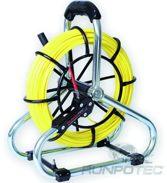 Lieferumfang: 1 x GF4.5 Glasfaserstab Ø 4,5 mm Standard-Set, Länge: 40 m, Edelstahl-Endhülsen beidseitig (Anfang/Ende), 1 x Stahlhaspel Ø 330 mm inkl. Doppelauslaufsystem, 1 x RG7 RUNPOGLEITER mit Frontgewinde