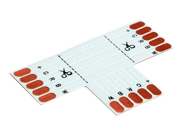 T-Stück oder 90° Ecke für RGBW LED Strips 12 mm je nach Anwendung kann das T-Stück an den vorgegeben Schnittmarkierungen getrennt werden. LxBxH in mm: 34 x 23 x 0,3 kompatibel mit folgenden Verbindern: 70500, 70537