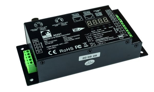 DMX Aktor Pro für die Innenanwendung, IP 20 DMX512 Schutzklasse III ,CE ,RoHS ,REACH Master (stand-alone) & Slave (DMX) Modus mit RDM Funktion Metallgehäuse mit Digitalanzeige zur direkten Anzeige der DMX-Parameter Mit mehreren Arten von DMX-Ein- / Ausgängen: RJ 45, XLR 5 pol. und normale Schraubkontakte. PWM Frequenz von 500 Hz bis 35 kHz einstellbar 8/16 Bit Auflösung einstellbar DMX Ein- und Ausgänge galvanisch getrennt 1-5 Kanäle und 1-5 Adressen einstellbar max. 8A pro Kanal Input: 12-24 V DC Output:12-24 V DC Leistung: 12V 96W pro Kanal/ 24V 192W pro Kanal LxBxH in mm: 165 x 73 x 39,5 Temperaturbereich: -20°C bis +50°C