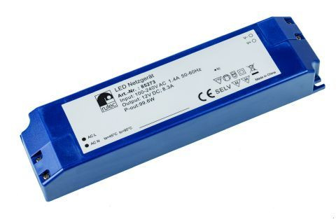 rutec Netzgerät, Konstantspannung für die Innenanwendung, IP20 mit Schraubklemmen und Zugentlastung CE, REACH, RoHS, MM, SELV, aktiv PFC Schutz gegen Kurzschluss, Überlast und Übertemperatur Leitungsquerschnitt Schraubklemmen: 0,75 - 2,5 qmm Gehäuse: Kunststoff Eingangsspannung: 100-240 V AC Leistung: 99,6 Watt Ausgangsstrom: 8,3 A Ausgangsspannung: 12 V DC LxBxH in mm: 204 x 53,5 x 30 Temperaturbereich: -20 bis +45°C Primärseitig nicht dimmbar