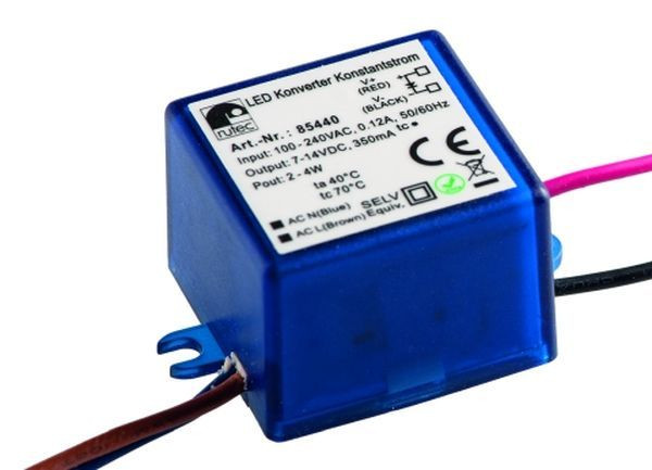 rutec LED Konverter Kontstantstrom für die Innenanwendung IP65 Gehäuse: Kunststoff Eingangsspannung: 100-240V AC Ausgangsstrom: 350mA Leistung: 2,5-4,9 Watt Maße LxBxH in mm: 42 x 29,5 x 21,5