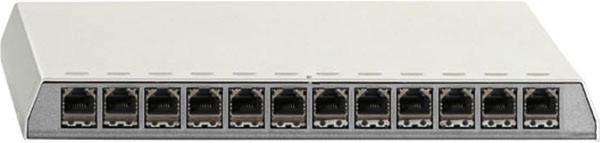 Aufputz-Patchpanel der Category 6A iso, mit 12 RJ45 Steckbuchsen für Tisch- oder Wandmontage, REG-Montage mit Hutschienenadapter (Art.-Nr. 186226), reinweiß