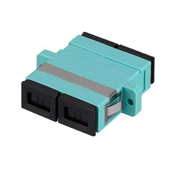 SC-D Kupplung, OM3, aqua, Kunststoffgehäuse zur Schraub- oder Einschnappmontage (Metall-Clip), geschlitzte Keramikhülse, mit Staubschutzkappen, Entsprechend nachfolgender Normanforderungen: - ISO 61754-4, MM PC, Grade B, Lebensdauer > 1000 Steckzyklen