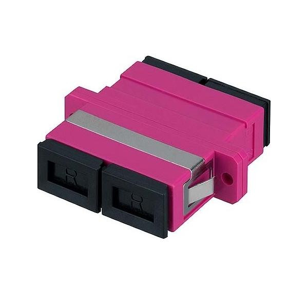 SC-D Kupplung, OM4, erika, Kunststoffgehäuse zur Schraub- oder Einschnappmontage (Metall-Clip), geschlitzte Keramikhülse, mit Staubschutzkappen, Entsprechend nachfolgender Normanforderungen: - ISO 61754-4, MM PC, Grade B, Lebensdauer > 1000 Steckzyklen