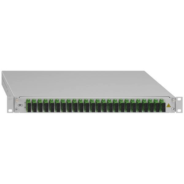 "Spleissbox, ausziehbar, 19""/1HE, 24xSC-D OS2 APC grün"; - pulverbeschichtetes Stahlblechgehäuse; - werkseitige Portkennzeichnung; - mit Gleitauszug, Auszugtiefe ca. 20 cm; - im geöffneten Zustand nach unten neigbar; - mit Rändelschrauben verschließbar; - 40 mm rückversetzbare Box; - Spleisskassette zur Aufnahme von 12 oder 24 Pigtails; - mit max. 4 Spleisskassetten bestückbar (fixiert); - eingelegter Crimpspleisshalter; - spleissfertig vorbereitet mit abgesetzten und eingelegten Pigtails inkl. 24 x SC-D-Keramik-Kupplungen; - SC-Faserpigtails E9/125 µm, 2 m, SM PC, Grade B; - mit Messprotokoll für alle Fasern inkl. Seriennummer; - 4 x rückseitige PG16-Verschraubungen (je 2 x rechts/links); - 1 x PG16-Verschraubung im Lieferumfang; - lichtgrau (ähnlich RAL 7035)