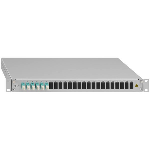 "Spleissbox, ausziehbar, 19""/1HE, 6xLC-D, OM3, aqua"; - pulverbeschichtetes Stahlblechgehäuse; - werkseitige Portkennzeichnung; - mit Gleitauszug, Auszugtiefe ca. 20 cm; - im geöffneten Zustand nach unten neigbar; - mit Rändelschrauben verschließbar; - 40 mm rückversetzbare Box; - Spleisskassette zur Aufnahme von 12 oder 24 Pigtails; - mit max. 4 Spleisskassetten bestückbar (fixiert); - eingelegter Crimpspleisshalter; - spleissfertig vorbereitet mit abgesetzten und eingelegten Pigtails inkl. 6 x LC-D-Keramik-Kupplungen; - LC-Faserpigtails G50/125 µm, 2 m, MM PC, Grade B; - mit Messprotokoll für alle Fasern inkl. Seriennummer; - montierte Blindstopfen bei weniger als 24 Ports; - 4 x rückseitige PG16-Verschraubungen (je 2 x rechts/links); - 1 x PG16-Verschraubung im Lieferumfang; - lichtgrau (ähnlich RAL 7035)