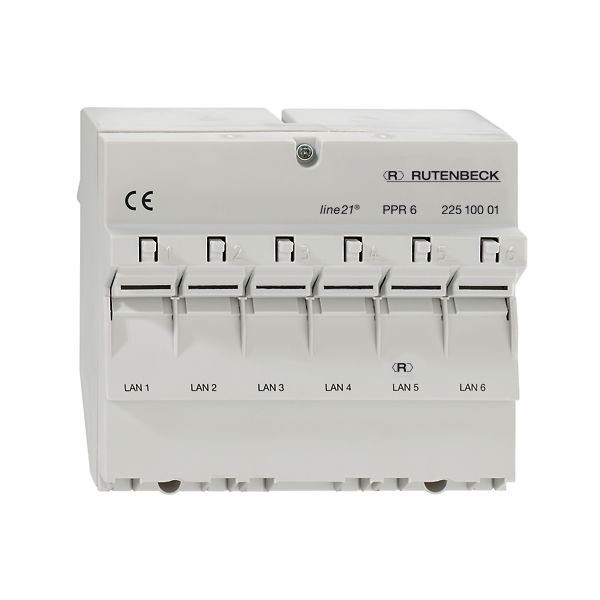 line21®-Patchpanel, REG, für bis zu 6 line21®-Linien, für Anwendungen bis 100 Mbit/s, lichtgrau (ähnlich RAL 7035); - für DIN-Schienenmontage (6TE, ca. 108 mm); - Isolationsklasse II; - Schutzart IP 20; - für bis zu 6 line21®-Linien; - Datenrate 10/100 Mbit/s (Leitungslänge 30/50 m); - Zugentlastung für zugeführte Kabel; - Anschluss für je 6 Telefon- und line21®-Linien über LSA-Kontakte; - LSA-Kontakte für Leiter 0,4 bis 0,6 mm, AWG 26 bis AWG 22 Außendurchmesser 0,7 bis 1,1 mm; 50 mal wiederbelegbar, zum Anschluss von line21® mit analogen Telefonsignalen