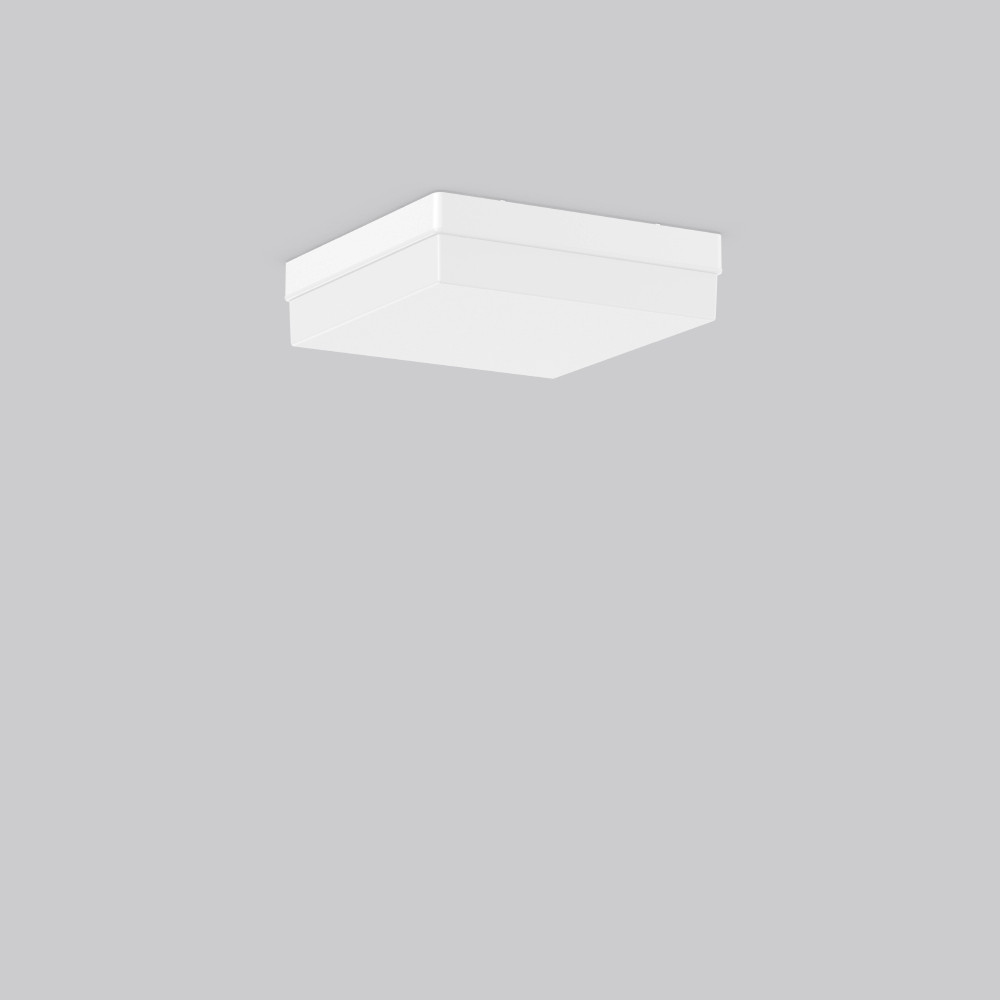 Flache quadratische Anbauleuchte. Armatur Kunststoff. Diffusor Kunststoff (Polypropylen) opal seidenmatt. Befestigung des Diffusors mit Federsystem. IP 43 Deckenmontage, IP 44 Wandmontage.