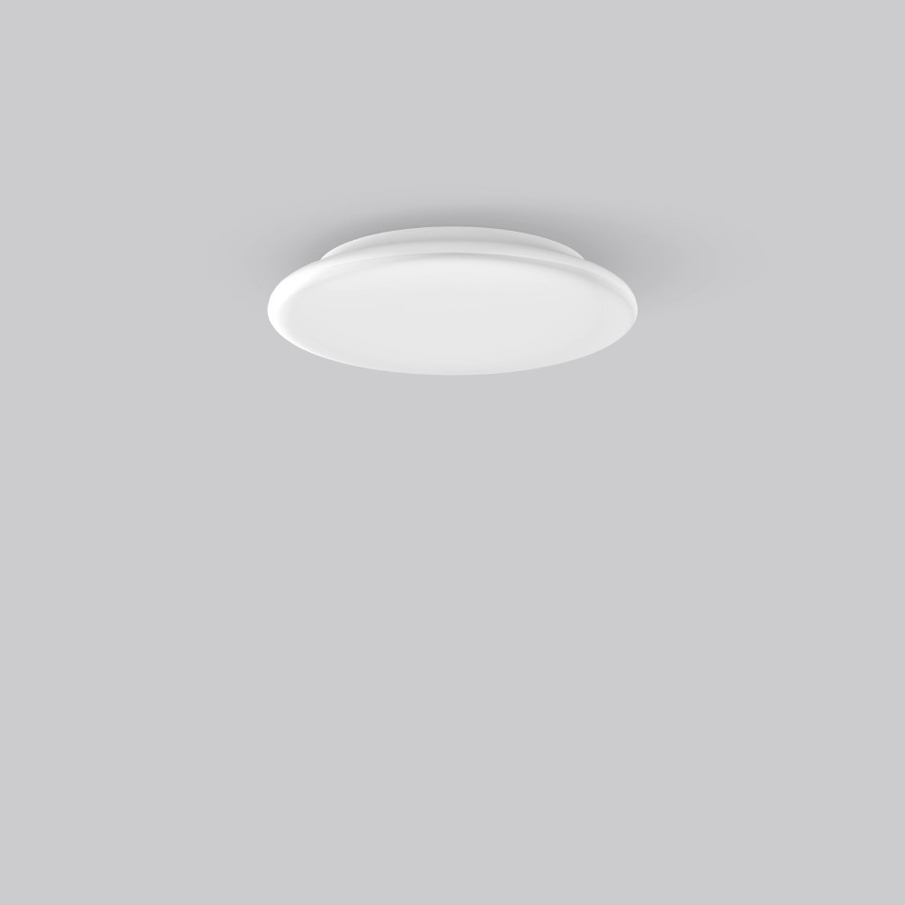 Flache dekorative runde LED-Anbauleuchte. Gehäuse Kunststoff (Polycarbonat). Diffusor Kunststoff (Polycarbonat) opal. Gehäuse und Diffusor fest verbunden. MultiColour: Farbtemperatur mit Schaltelement einstellbar auf 3000 K (Werkseinstellung), 4000 K und 5700 K. Schnellmontageadapter Stahlblech weiß pulverbeschichtet, mit Bajonettbefestigung. Betriebsgerät integriert.
