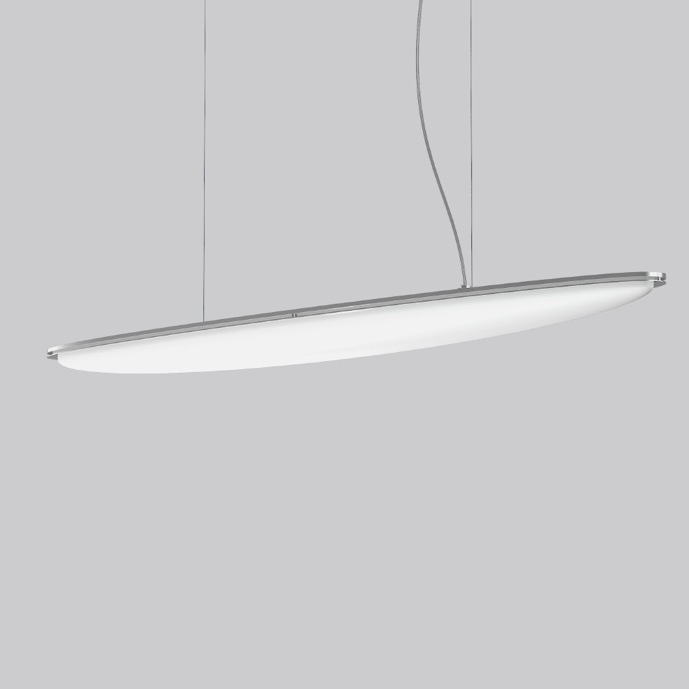 Pendelleuchte in elliptischer Form. Armatur Aluminium pulverbeschichtet. Baldachin und Glashaltering Stahlblech pulverbeschichtet. Handgefertigtes Senkglas, außen mattiert mit weißer Innenlackierung. Homogene und blendfreie Ausleuchtung des Schiffchenkorpus durch speziell angepasste LED-Flächenplatinen. Geeignet für Pendel. 2-Punkt Stahlseilabhängung stufenlos höhenverstellbar oder gewünschte Sonderlängen auf Anfrage. TouchDim Sensor fähig. Sensoren für Helligkeit und/oder Anwesenheit können mit eingebunden werden.