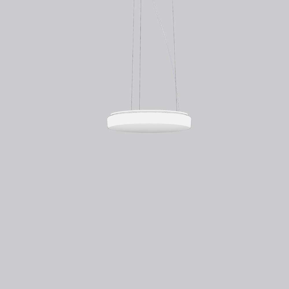 Dekorative runde LED Pendelleuchte. Armatur und Baldachin Metall pulverbeschichtet weiß. Baldachin Ø 205 mm, h 35 mm. Diffusor aus vergilbungsfreiem Kunststoff (PMMA) opal. Befestigung des Diffusors mit patentierter Verschlusstechnik (Druckverschluss). Homogene und weiche Ausleuchtung. Geeignet für Pendel. 3-Punkt Stahlseilabhängung stufenlos höhenverstellbar oder gewünschte Sonderlängen auf Anfrage. TouchDim Sensor fähig. Sensoren für Helligkeit und/oder Anwesenheit können mit eingebunden werden.
