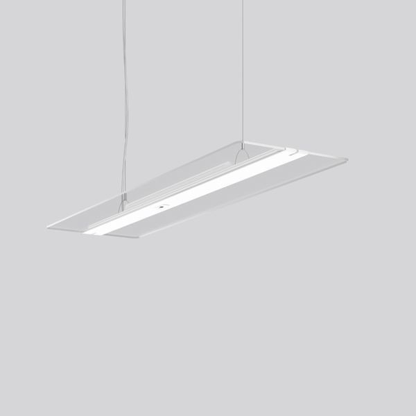 LED-Pendelleuchte mit extrem flachen und rahmenlosen Erscheinungsbild. Leuchtenmittelsteg aus Aluminium-Strangpressprofil, pulverbeschichtet. Transparenter Lightguide aus UV-stabilem Acrylglas (PMMA) mit TWINDOT-Prismatik. Lichtlenkung durch perfekt blendfreie TWINDOT-Technologie für angenehm sanftes Licht mit weichen Schatten. Gleichmäßig breite Lichtverteilung indirekt und direkt. Lichtaustritt direkt 55%, indirekt 45%. 2-Punkt Stahlseilabhängung stufenlos höhenverstellbar mit transparenter Anschlussleitung. Betriebsgerät im Leuchtenmittelsteg integriert. Integrierter Sensor zur tageslicht, und präsenzabhängigen Lichtsteuerung. Präsenzerfassungsbereich einstellbar über integrierte Shutter zwischen 40° und 90°. Arbeitsbereich Lichtsensor: 20-800 lx (gemessen am Sensor). Montagehöhe: 2-5 m. Erfassungsbereich (bei einer Höhe von 2, 5 m): Ø 1, 8-5 m. Max. Erfassungsbereich (bei max. Montagehöhe von 5 m): Ø 7 m. Hervorragend geeignet für Bürobereiche (RUG = 19) und Bildschirmarbeitsplätze (BAP) gem. DIN EN 12464-1.