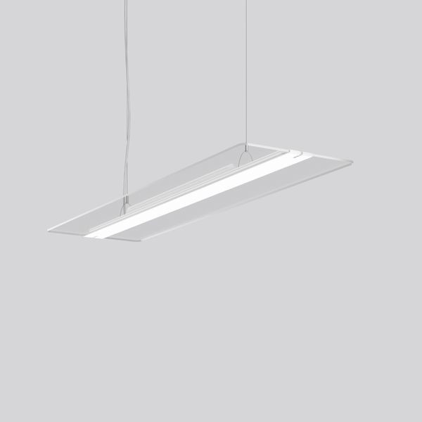 LED-Pendelleuchte mit extrem flachen und rahmenlosen Erscheinungsbild. Leuchtenmittelsteg aus Aluminium-Strangpressprofil, pulverbeschichtet. Transparenter Lightguide aus UV-stabilem Acrylglas (PMMA) mit TWINDOT-Prismatik. Lichtlenkung durch perfekt blendfreie TWINDOT-Technologie für angenehm sanftes Licht mit weichen Schatten. Gleichmäßig breite Lichtverteilung indirekt und direkt. Lichtaustritt direkt 55%, indirekt 45%. 2-Punkt Stahlseilabhängung stufenlos höhenverstellbar mit transparenter Anschlussleitung. Betriebsgerät im Leuchtenmittelsteg integriert. Erweiterbar zum Lichtband durch Verbindungskit. Hervorragend geeignet für Bürobereiche (RUG = 19) und Bildschirmarbeitsplätze (BAP) gem. DIN EN 12464-1.