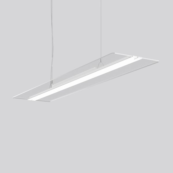 LED-Pendelleuchte mit extrem flachen und rahmenlosen Erscheinungsbild. Leuchtenmittelsteg aus Aluminium-Strangpressprofil, pulverbeschichtet. Transparenter Lightguide aus UV-stabilem Acrylglas (PMMA) mit TWINDOT-Prismatik. Lichtlenkung durch perfekt blendfreie TWINDOT-Technologie für angenehm sanftes Licht mit weichen Schatten. Gleichmäßig breite Lichtverteilung indirekt und direkt. Lichtaustritt direkt 55%, indirekt 45%. 2-Punkt Stahlseilabhängung stufenlos höhenverstellbar mit transparenter Anschlussleitung. Betriebsgerät im Leuchtenmittelsteg integriert. Tunable White dynamisch einstellbar von 2700 K bis 6500 K. Für Human Centric Lighting (HCL) in Verbindung mit RZB-Lichtmanagementsystemen geeignet. Hervorragend geeignet für Bürobereiche (RUG = 19) und Bildschirmarbeitsplätze (BAP) gem. DIN EN 12464-1.