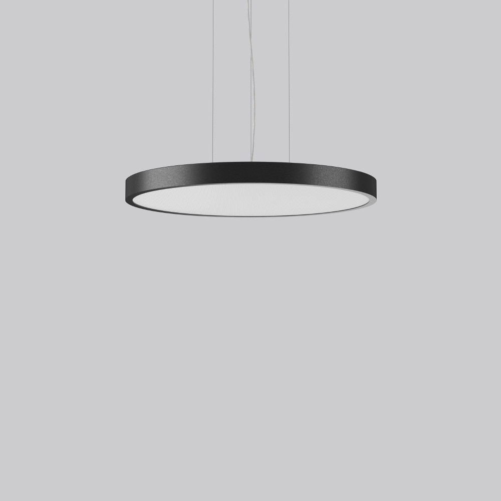 Dekorative runde LED Pendel-Flächenleuchte. Flacher nahtloser Rahmen Aluminium-Strangpressprofil pulverbeschichtet. Abdeckung Stahlblech pulverbeschichtet. Baldachin Aluminium pulverbeschichtet. Direkter Lichtaustritt über Diffusor Kunststoff opal/prismatisch. Indirekter Lichtaustritt über flächenbündigen Diffusor aus Kunststoff satiniert. Diffusor und Lightguide aus vergilbungsfreiem Kunststoff (PMMA). Seitliche Lichteinkopplung (RZB SIDELITE-Technologie) für überdurchschnittlich homogene Leuchtdichteverteilung und randlose Ausleuchtung. Lichtaustritt direkt 70%, indirekt 30%. 3-Punkt Stahlseilabhängung stufenlos höhenverstellbar. Einfache Montage mit transparenter, kürzbarer Pendelleitung und Baldachin mit Magnetbefestigung. Betriebsgerät integriert.