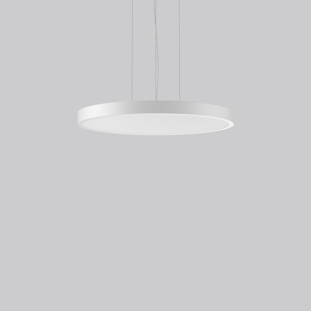 Dekorative runde LED Pendel-Flächenleuchte. Flacher nahtloser Rahmen Aluminium-Strangpressprofil pulverbeschichtet. Abdeckung Stahlblech pulverbeschichtet. Baldachin Aluminium pulverbeschichtet. Lichtaustritt über Diffusor Kunststoff opal/prismatisch. Diffusor und Lightguide aus vergilbungsfreiem Kunststoff (PMMA). Seitliche Lichteinkopplung (RZB SIDELITE-Technologie) für überdurchschnittlich homogene Leuchtdichteverteilung und randlose Ausleuchtung. 3-Punkt Stahlseilabhängung stufenlos höhenverstellbar. Einfache Montage mit transparenter, kürzbarer Pendelleitung und Baldachin mit Magnetbefestigung. Betriebsgerät integriert. Mit Casambi smart+free Bluetooth Steuerung zur drahtlosen Vernetzung und Bedienung mittels Android / iOS Gerät, kostenlose App zum Download verfügbar. Hervorragend geeignet für Bürobereiche (RUG = 19) und Bildschirmarbeitsplätze (BAP) gem. DIN EN 12464-1.