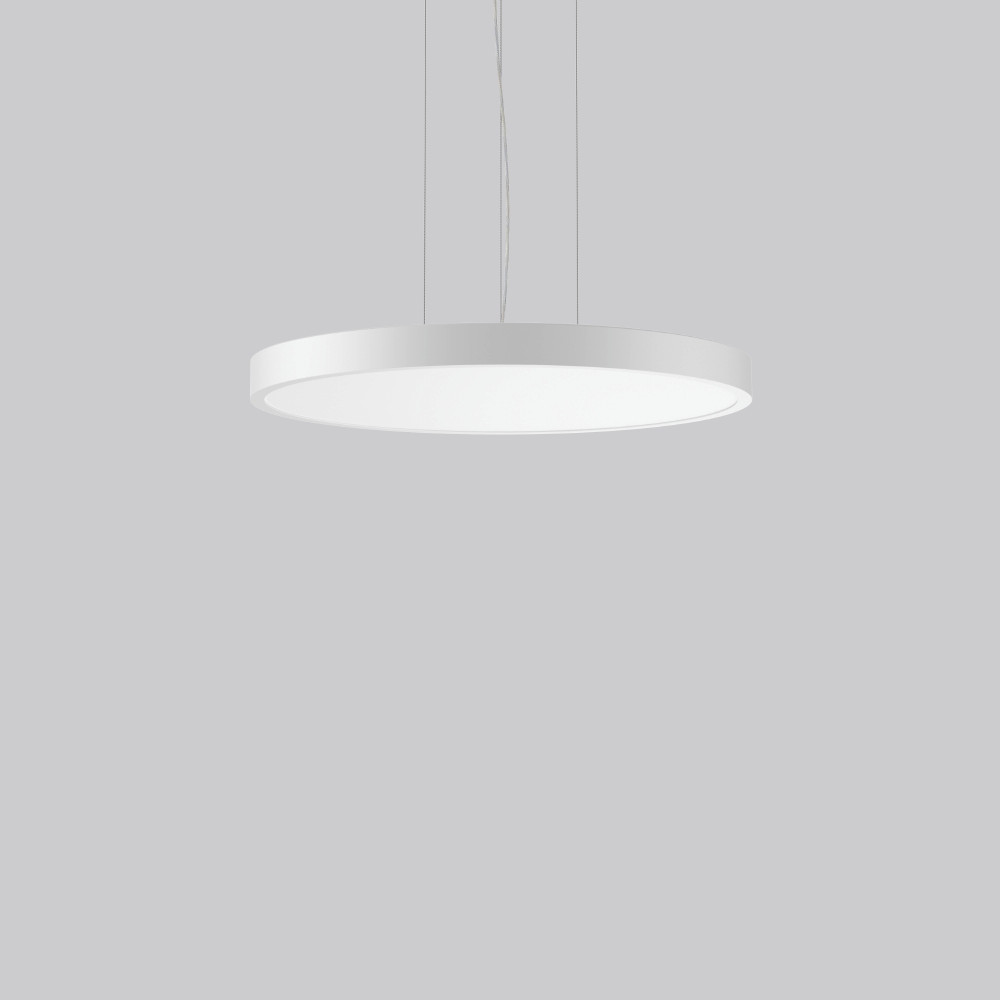 Dekorative runde LED Pendel-Flächenleuchte. Flacher nahtloser Rahmen Aluminium-Strangpressprofil pulverbeschichtet. Abdeckung Stahlblech pulverbeschichtet. Baldachin Aluminium pulverbeschichtet. Lichtaustritt über Diffusor Kunststoff opal. Diffusor und Lightguide aus vergilbungsfreiem Kunststoff (PMMA). Seitliche Lichteinkopplung (RZB SIDELITE-Technologie) für überdurchschnittlich homogene Leuchtdichteverteilung und randlose Ausleuchtung. 3-Punkt Stahlseilabhängung stufenlos höhenverstellbar. Einfache Montage mit transparenter, kürzbarer Pendelleitung und Baldachin mit Magnetbefestigung. Betriebsgerät integriert. Mit Casambi smart+free Bluetooth Steuerung zur drahtlosen Vernetzung und Bedienung mittels Android / iOS Gerät, kostenlose App zum Download verfügbar.
