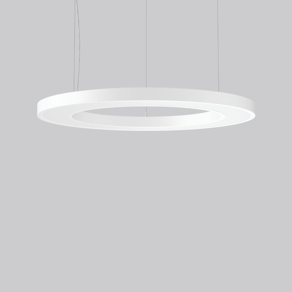 Dekorative ringförmige Pendelleuchte. Flacher nahtloser Rahmen Aluminium-Strangpressprofil pulverbeschichtet. Direkter Lichtaustritt über Diffusor Kunststoff opal. Indirekter Lichtaustritt über flächenbündigen Diffusor aus Kunststoff satiniert. Diffusor und Lightguide aus vergilbungsfreiem Kunststoff (PMMA). Seitliche Lichteinkopplung (RZB SIDELITE-Technologie) für überdurchschnittlich homogene Leuchtdichteverteilung und randlose Ausleuchtung. Baldachin Stahlblech pulverbeschichtet mit Magnetbefestigung. Transparente Zuleitung 5 m (kürzbar). Seilabhängung 5 m (kürzbar) mit 3 Einzelseilen frei positionierbar. Montage an Schrägdecken mit einer Neigung bis 35° möglich. Schrägstellung der Leuchte bis 25° möglich. Lichtaustritt direkt/indirekt getrennt schalt, und regelbar.