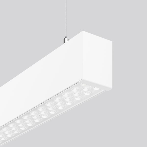 Formschöne Pendelleuchte. Gehäuse Aluminium-Strangpressprofil pulverbeschichtet. Endkappen Aluminium pulverbeschichtet, ohne sichtbare Schrauben. Hocheffiziente LED-Einheiten mit optimaler Lichtlenkung durch präzise Linsenoptik aus Kunststoff (PC) klar. 2-Punkt Stahlseilabhängung frei positionierbar und stufenlos höhenverstellbar. Mit Anschlussleitung (2, 5 m). Baldachin bei Bedarf bitte separat bestellen. Hervorragend geeignet für Bürobereiche (RUG = 19) und Bildschirmarbeitsplätze (BAP) gem. DIN EN 12464-1.