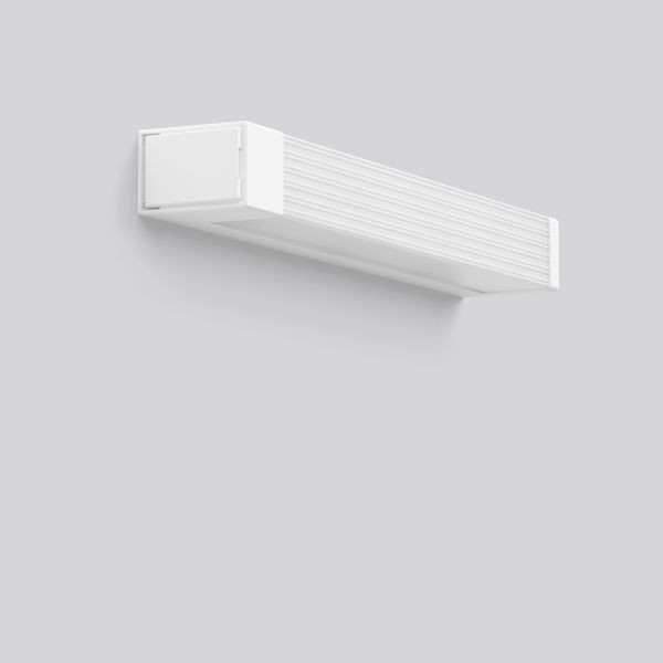 Linienleuchte als Wand, und Spiegelleuchte einsetzbar. Armatur Kunststoff. Endkappen Kunststoff. Mundgeblasenes Opalglas seidenglanz. Mit Schuko-Steckdose.
