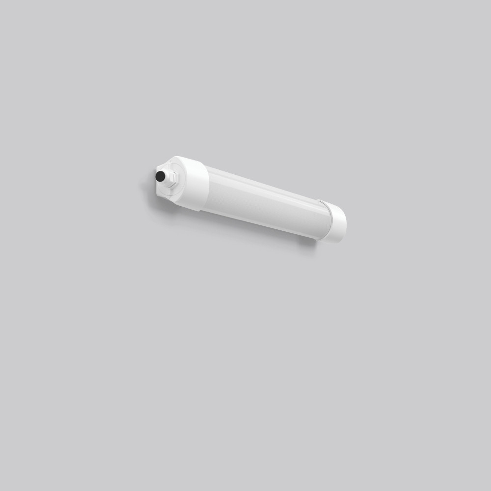 Designorientierte Feuchtraumleuchte. Seitenteile Kunststoff (Polycarbonat) weiß, schlagzäh. Diffusor aus Kunststoff (Polycarbonat) opal, schlagzäh. Diffusor extrudiert, innenprismatisch und UV-beständig. Lichtverteilung symmetrisch. Homogene Ausleuchtung. Rückwärtiger Lichtanteil zur Deckenaufhellung. Betriebsgerät gekapselt, integriert und fest verbunden mit dem Diffusor und Seitenteil. Komfortable Leitungseinführung über Kabelverschraubungen. Einfache Installation durch Drehverschluss auf beiden Seiten. Leuchte mit integrierter Durchgangsverdrahtung für das Aneinanderreihen von weiteren Leuchten. Leuchte mit begrenzter Oberflächentemperatur nach DIN EN 60598-2-24 zur Verwendung in einer Umgebung, in der eine Ablagerung von leitfähigem Staub auf der Leuchte erwartet werden kann. Zugelassen für den Einsatz in der Lebensmittel, und Getränkeindustrie.