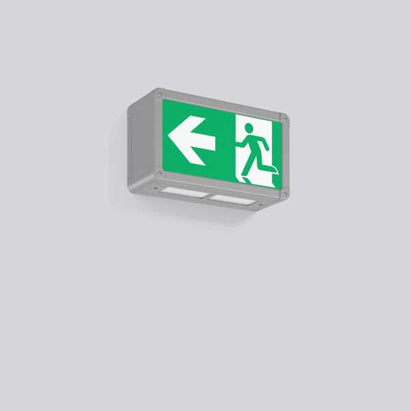 Leuchte zur Rettungswegkennzeichnung. Gehäuse Aluminium mit Eckverbindungen Kunststoff. Kunststoffscheibe opal mit Rettungszeichen einseitig. Betriebsgeräte integriert. Einzelbatteriesystem mit automatischem Selbsttest.