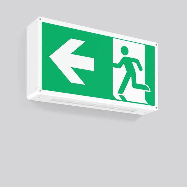 Leuchte zur Rettungswegkennzeichnung. Gehäuse Aluminium mit Eckverbindungen Kunststoff. Kunststoffscheibe opal mit Rettungszeichen einseitig. Betriebsgeräte integriert. Einzelbatteriesystem mit automatischem Selbsttest.