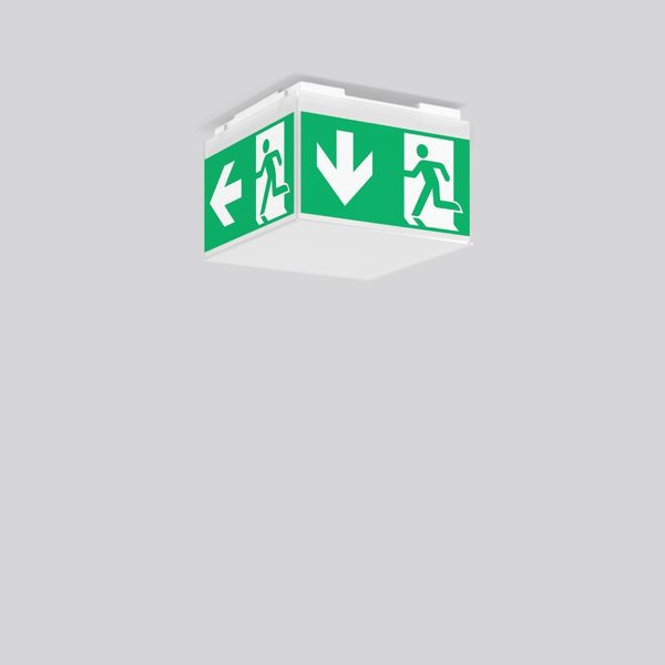 Leuchte zur Rettungswegkennzeichnung. Armatur Aluminium-Druckguss pulverbeschichtet Diffusor Kunststoff (PMMA) opal. 4 Folien zur Rettungswegkennzeichnung beigelegt (nach ISO 7010). Betriebsgerät integriert. Zum Anschluss an zentrale Sicherheitsstromversorgung geeignet. Durch Zubehör als Pendelleuchte montierbar.