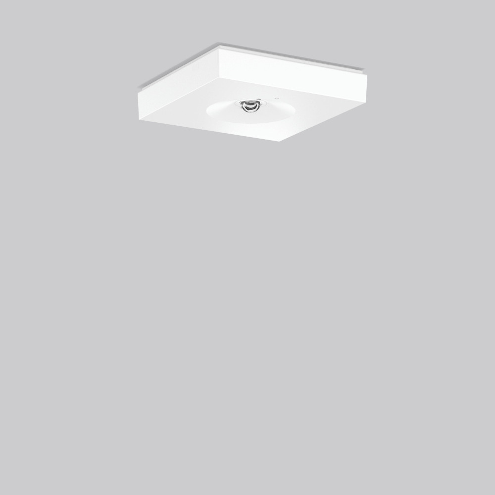 Flache quadratische Anbauleuchte. Zur Rettungswegbeleuchtung. Gehäuse Kunststoff (Polycarbonat). Abdeckung Kunststoff (Polycarbonat). Kunststofflinsen zur Flächen, und Rettungswegbeleuchtung im Lieferumfang enthalten. Linsen sind werkzeuglos austauschbar. Zum Anschluss an zentrale Sicherheitsstromversorgung geeignet.