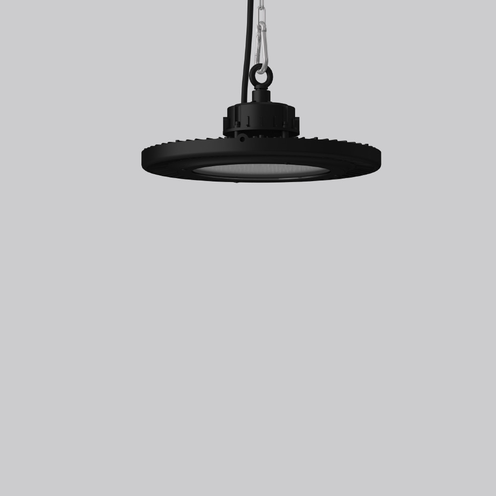 Runder Hallenstrahler für Ketten- oder Seilabhängung. Robustes Gehäuse aus Aluminium-Druckguss mit Ringöse, pulverbeschichtet. Vertikale Kühlrippen gewährleisten eine konstante Wärmeableitung und sorgen somit für ein optimales Thermomanagement. Diffusor aus entspiegeltem Einscheiben-Sicherheitsglas (ESG) klar. Primäre Lichtlenkung mit Hochleistungs-Flächen-LED. Einfache Installation durch Ein-Punkt-Aufhängung. Pendelabhängung über Kette oder Stahlseil bauseits. Mit Anschlussleitung (1,5 m). Dimmbereich 10% bis 100%. Decken- und Wandmontagebügel als Zubehör erhältlich. Blendungsbegrenzung durch Zubehör mit Reflektor oder Refraktor. Leuchten mit begrenzter Oberflächentemperatur nach DIN EN 60598-2-24 zur Verwendung in einer Umgebung, in der eine Ablagerung von leitfähigem Staub auf der Leuchte erwartet werden kann. Zugelassen für den Einsatz in der Lebensmittel- und Getränkeindustrie.