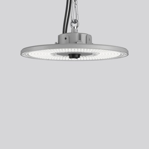 Runder Hallenstrahler mit präzisem Optiksystem für blendfreies Licht. Gehäuse Aluminium-Druckguss mit Ringöse, pulverlackiert. Optimiertes Thermomanagement durch spezielles Leuchtendesign. Selbstreinigender Kühlkörper für konstante Wärmeableitung. Speziell aufeinander abgestimmtes Linsenoptiksystem aus vergilbungsfreiem Kunststoff (Polycarbonat). Höchste Effizienz und blendfreies Licht bis RUG = 19. Einfache Installation durch Ein-Punkt-Aufhängung. Pendelabhängung über Kette oder Stahlseil bauseits. Decken, und Wandmontagebügel als Zubehör erhältlich. Anschlussleitung mit doppelt isolierter Mantelleitung, offene Leitungsenden. Dimmbereich 10% bis 100%. Leuchte mit begrenzter Oberflächentemperatur nach DIN EN 60598-2-24 zur Verwendung in einer Umgebung, in der eine Ablagerung von leitfähigem Staub auf der Leuchte erwartet werden kann.